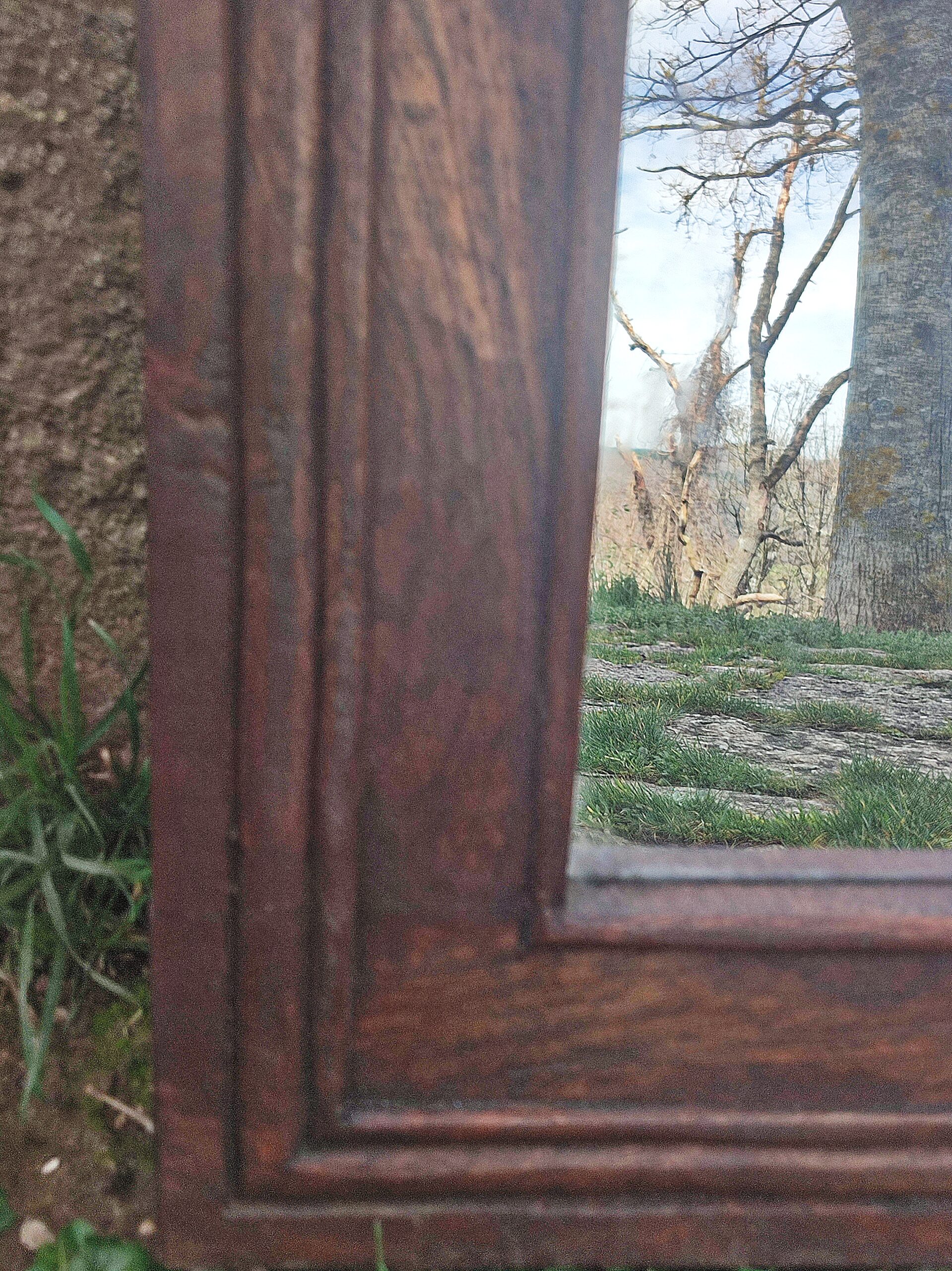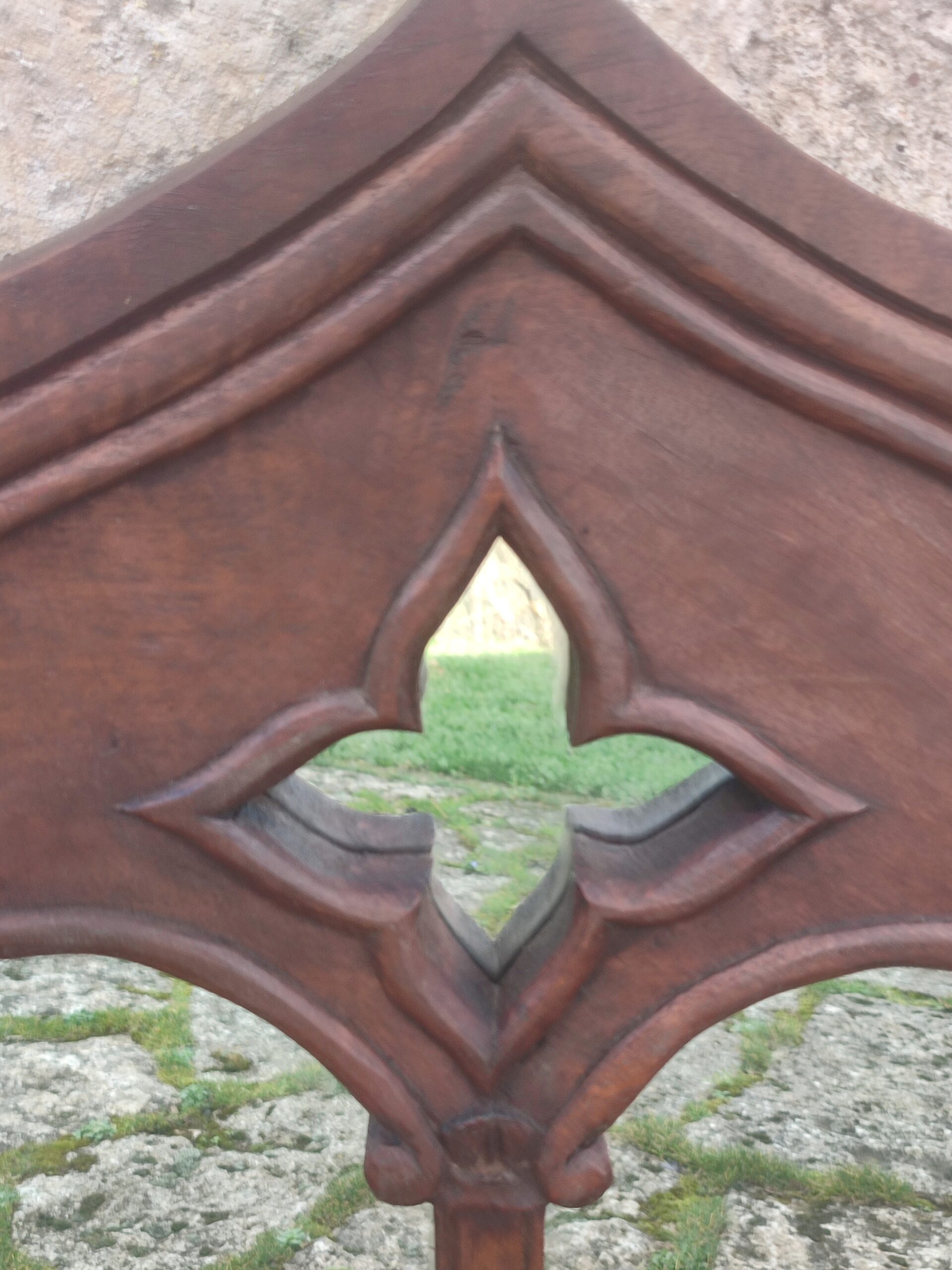 El espejo está dividido en dos por una columna y en su frente tiene una forma cuadrilobulada de inspiración gótica.