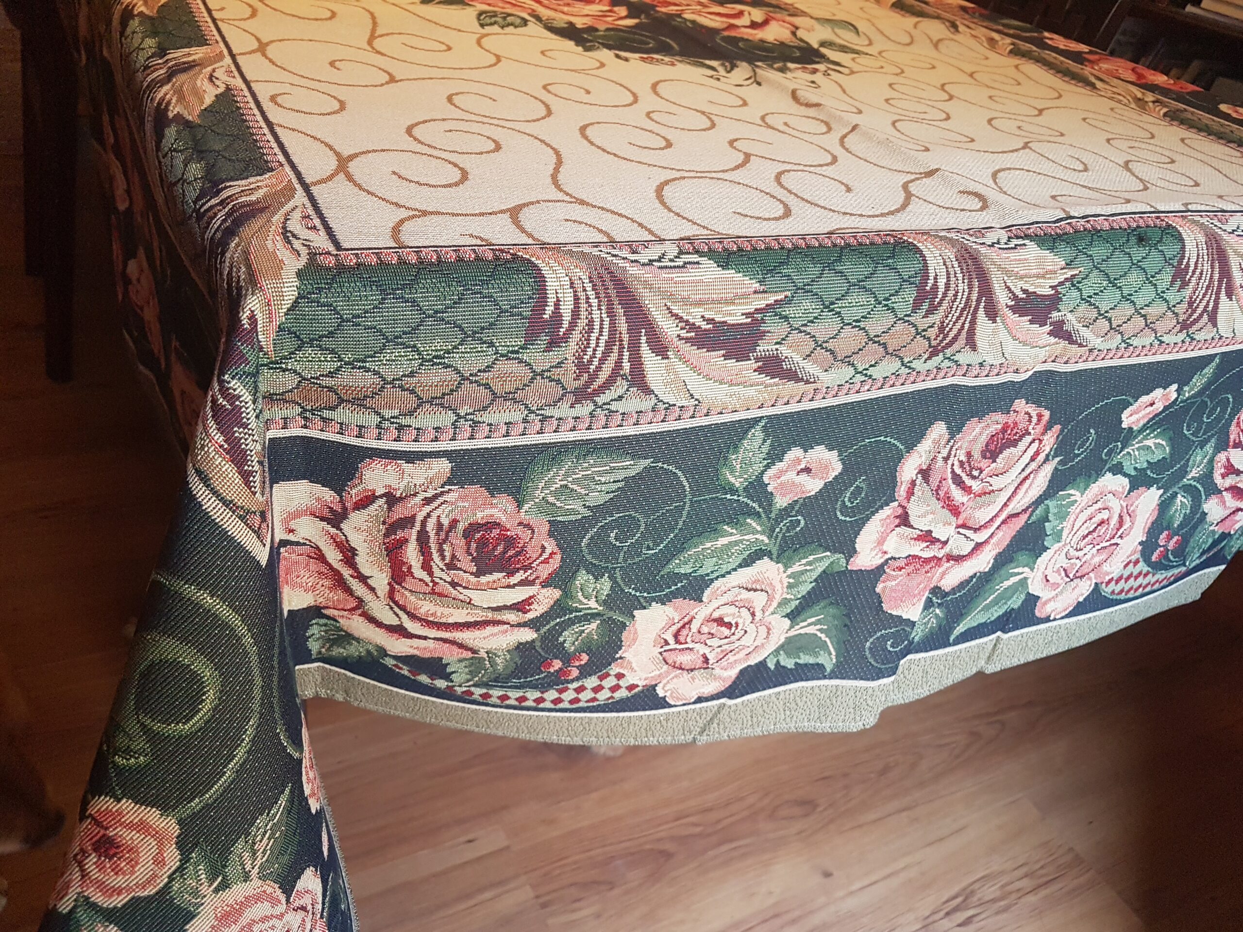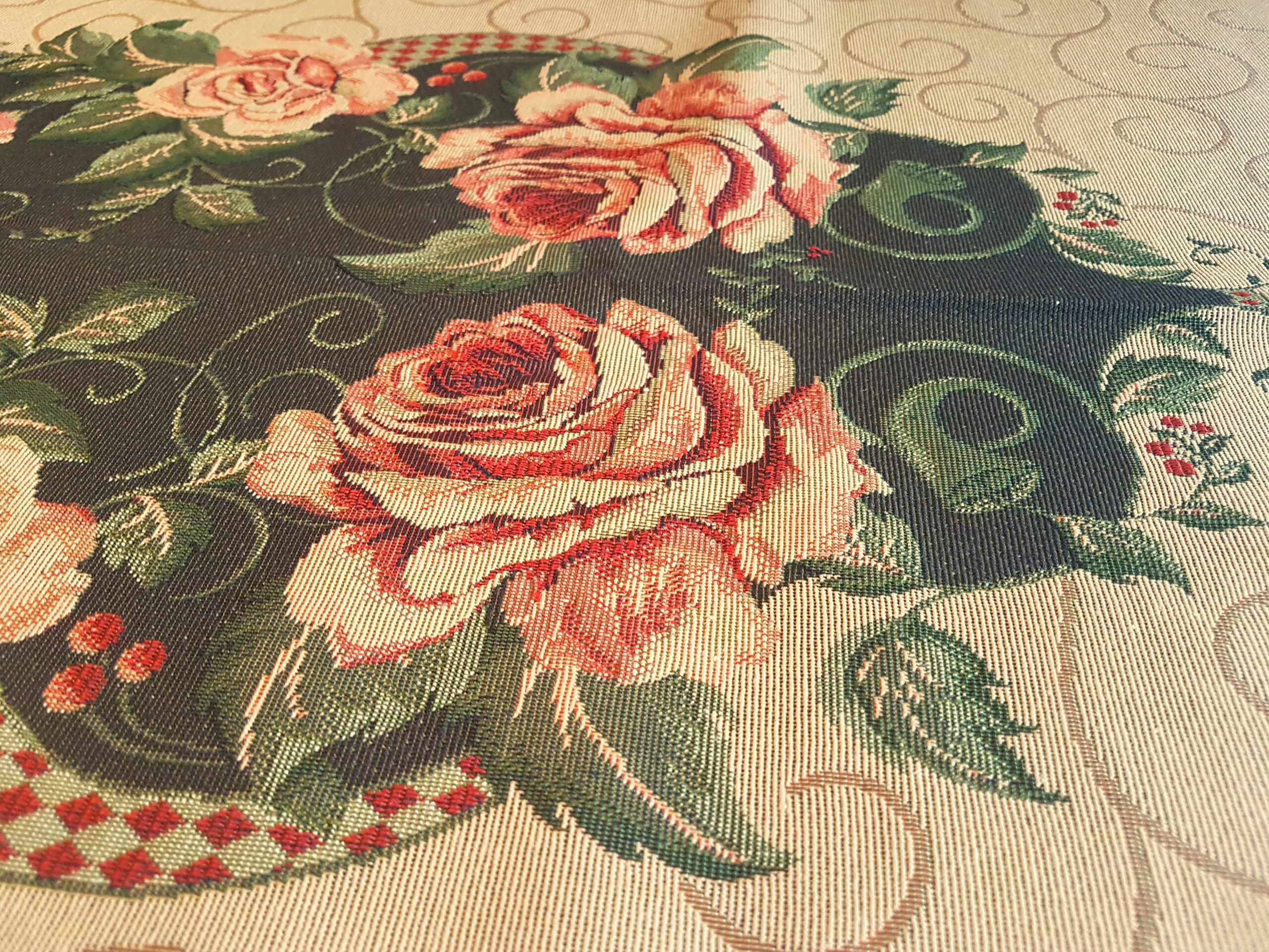 Precioso mantel mixto en tonos beis y verde oscuro. Para una mesa rectangular. Estampado con frutas.