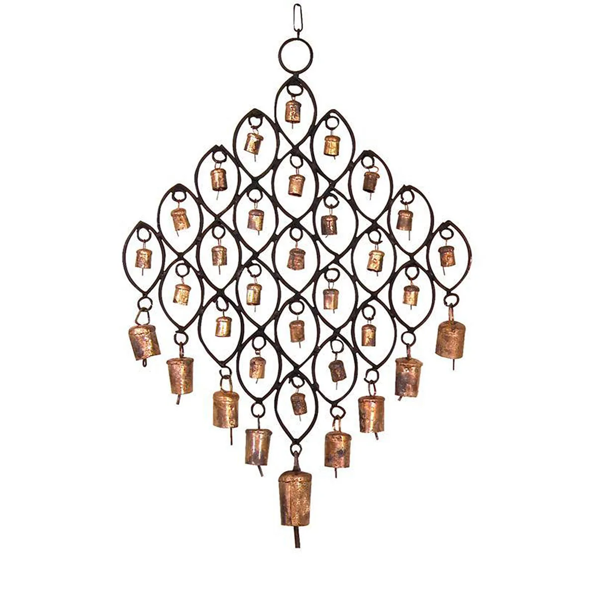 Móvil en forma de rombo con campanitas. La estructura es metálica. Al moverse, se puede escuchar un suave tintineo metálico muy suave. Se puede colgar en exterior o interior.