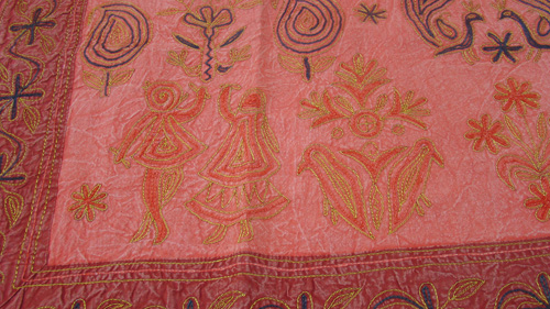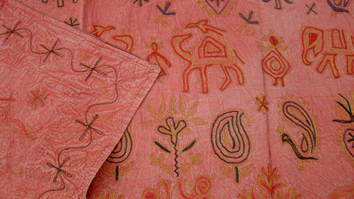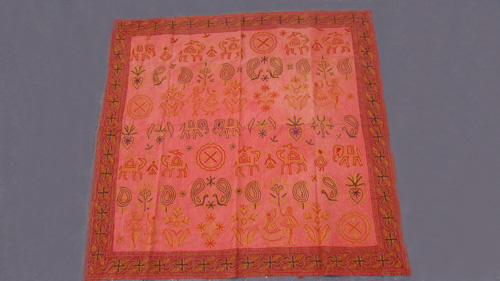 Tapiz de algodón con figuras en color rojo.