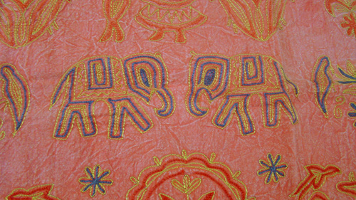 Las figuras están rodeadas con un pespunte de hilo dorado.